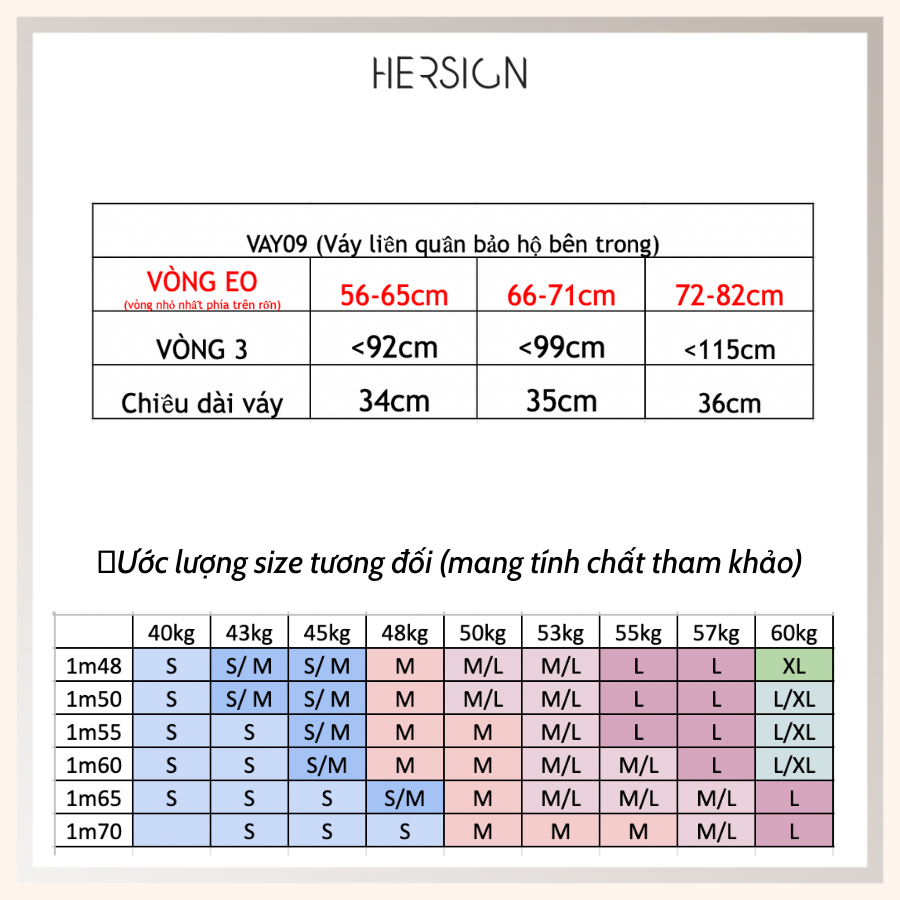 3. Bảng size là ước tính kích thước theo thể trạng trung bình nên đôi khi có thể đúng với người này nhưng lại không chính xác với người khác, do thể trạng cơ thể mỗi người mỗi khác. Trên thực tế những điểm như bắp tay, đùi, hông đôi khi lựa chọn size khác đi lại đem lại hiệu quả thẩm mỹ tốt hơn hẳn. Do đó đừng ngại ib cho HERSIGN để có được sự hỗ trợ tốt nhất.