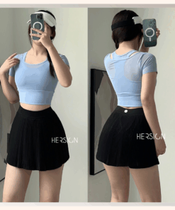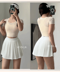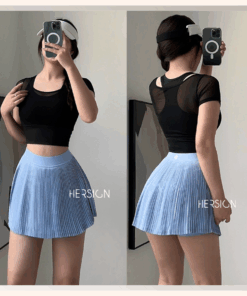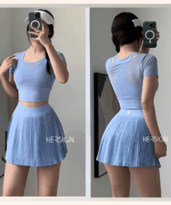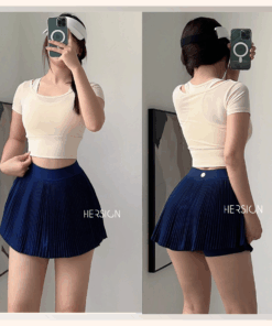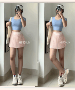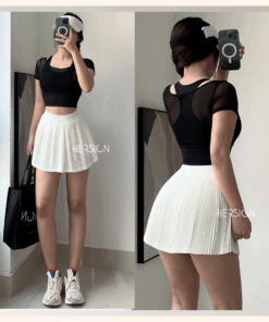 _Chân váy 2 lớp. Lớp ngoài xếp ly form xòe tạo độ phồng. Váy liền quần giúp thoải mái khi vận động.