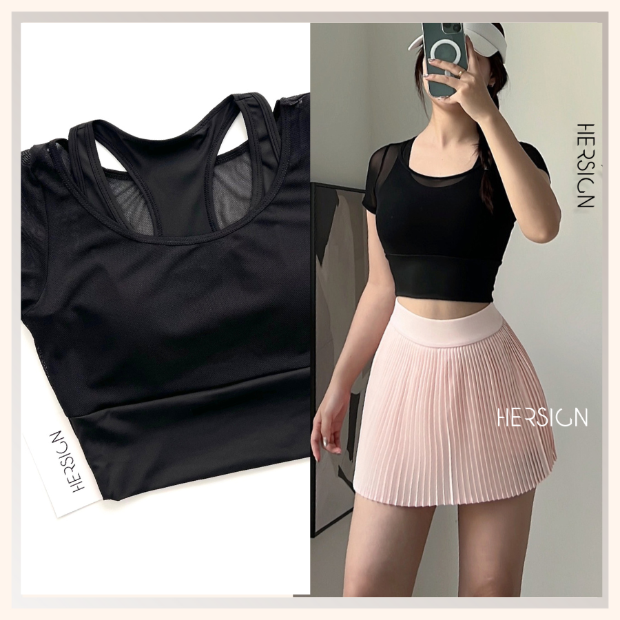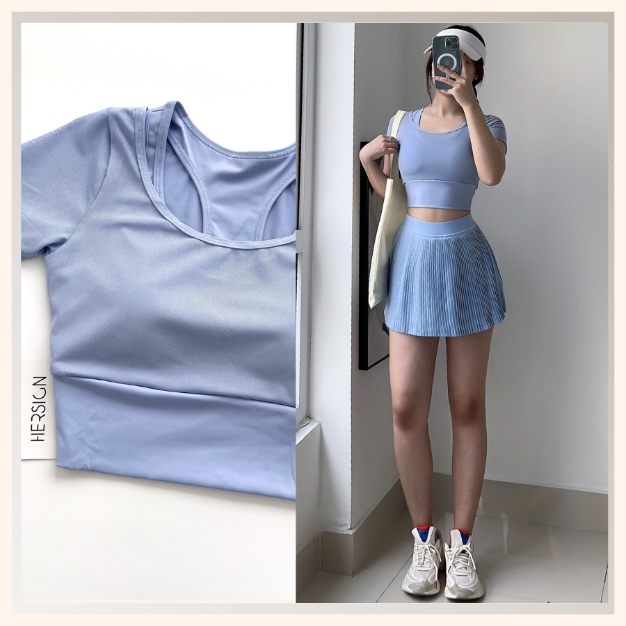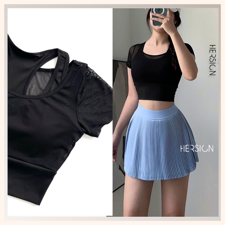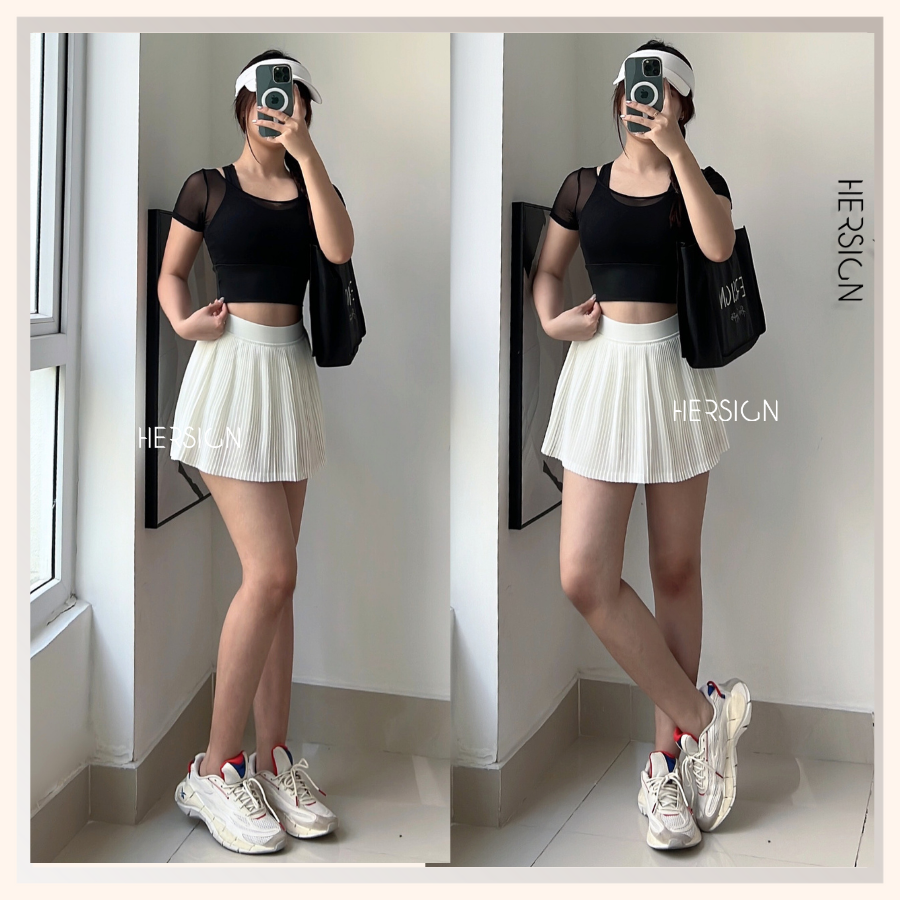 _Chân váy 2 lớp. Lớp ngoài xếp ly form xòe tạo độ phồng. Váy liền quần giúp thoải mái khi vận động.