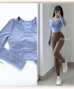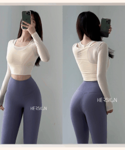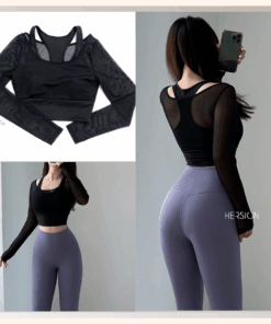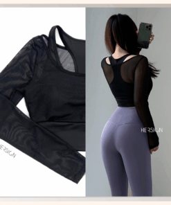 _Áo croptop dài tay 2 lớp. Lớp lưới bên ngoài co dãn mềm mát.