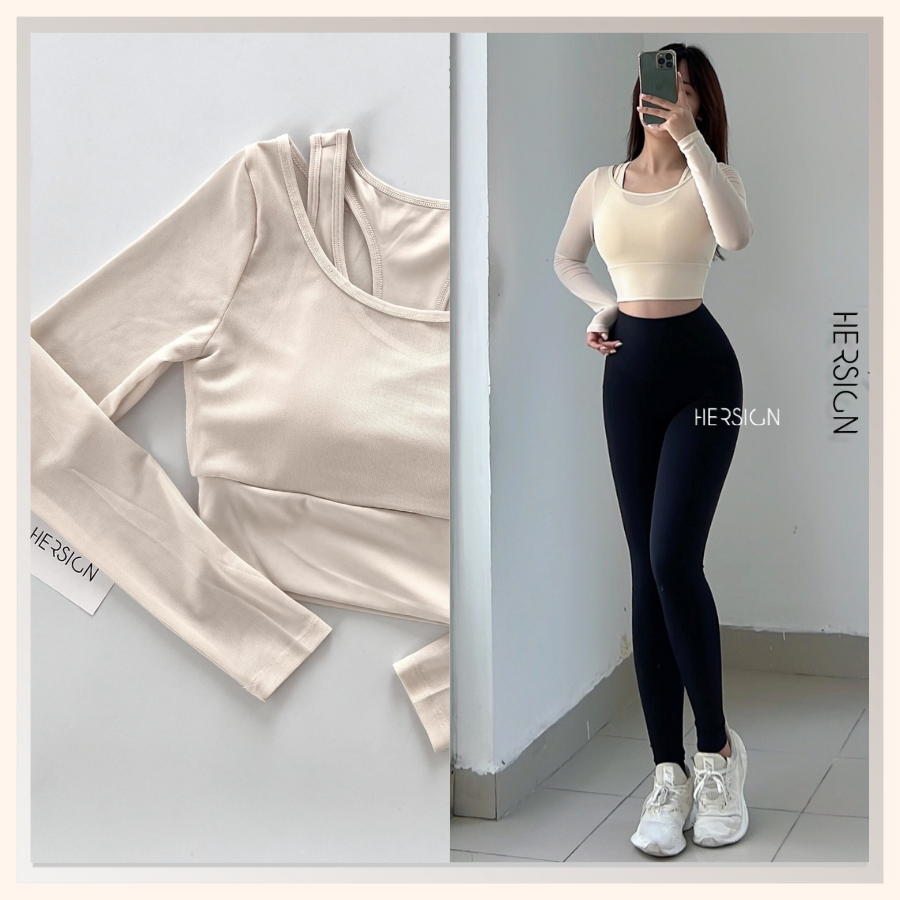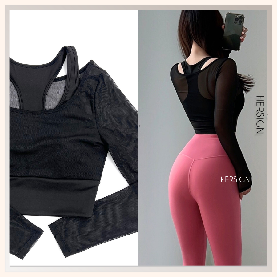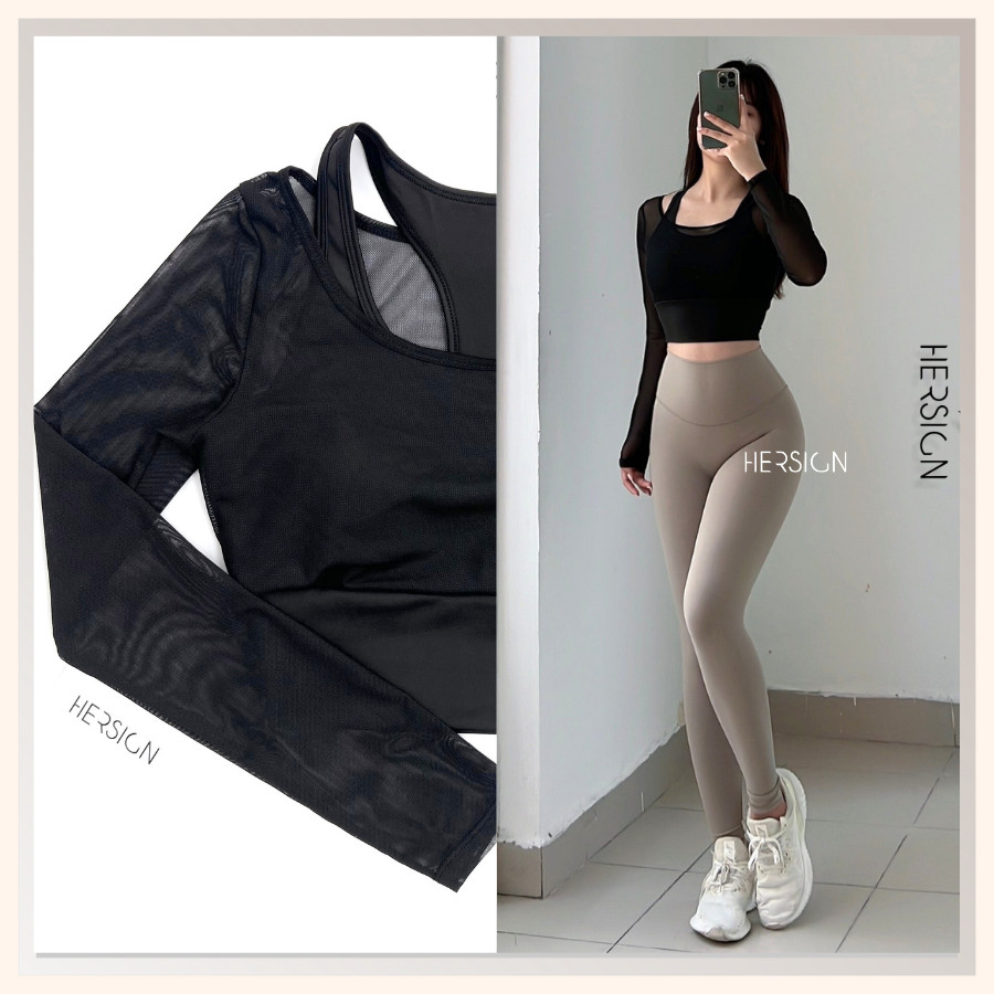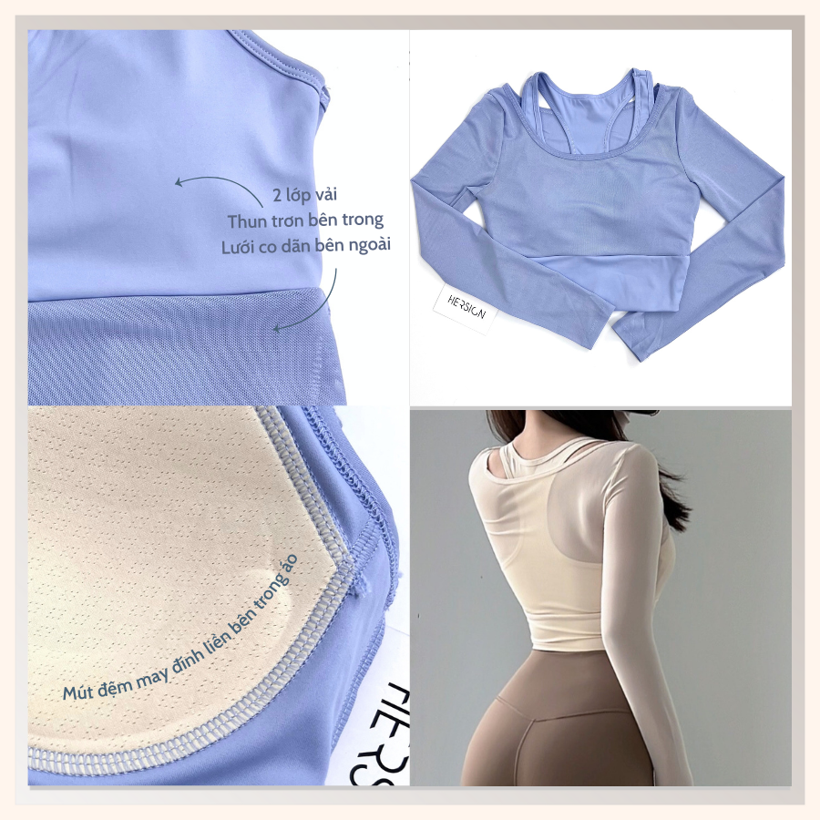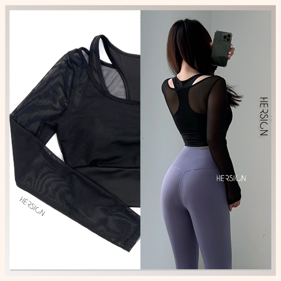 _Áo croptop dài tay 2 lớp. Lớp lưới bên ngoài co dãn mềm mát.
