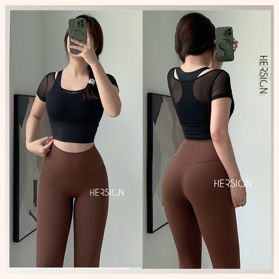 _Áo croptop dài tay thời trang 2 lớp. Lớp ngoài: lưới co dãn mềm mát, không châm chích.