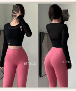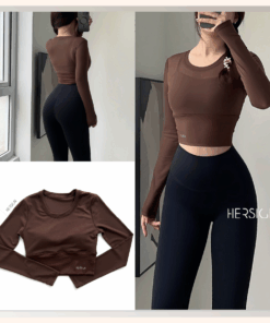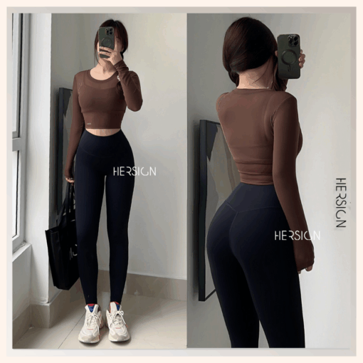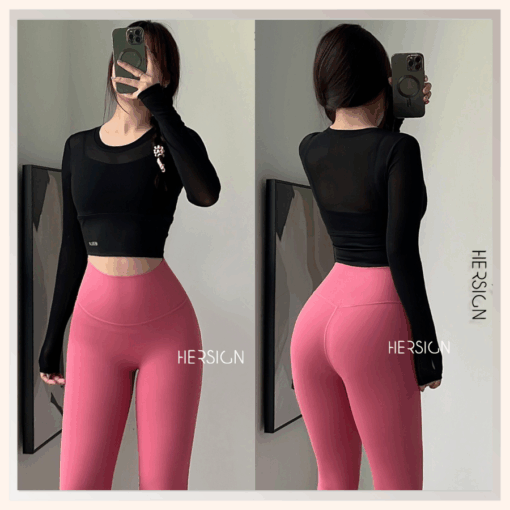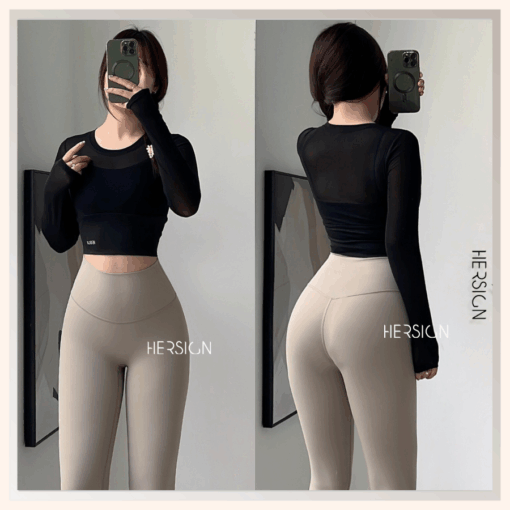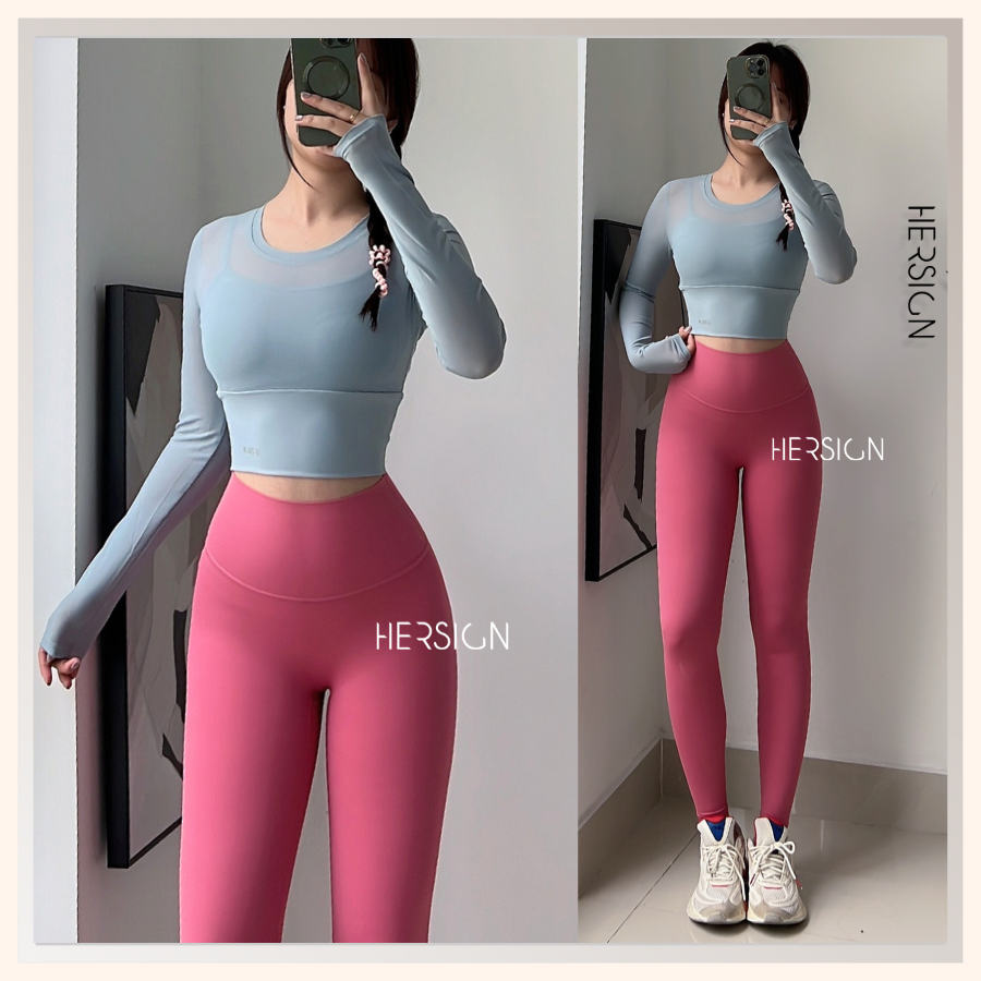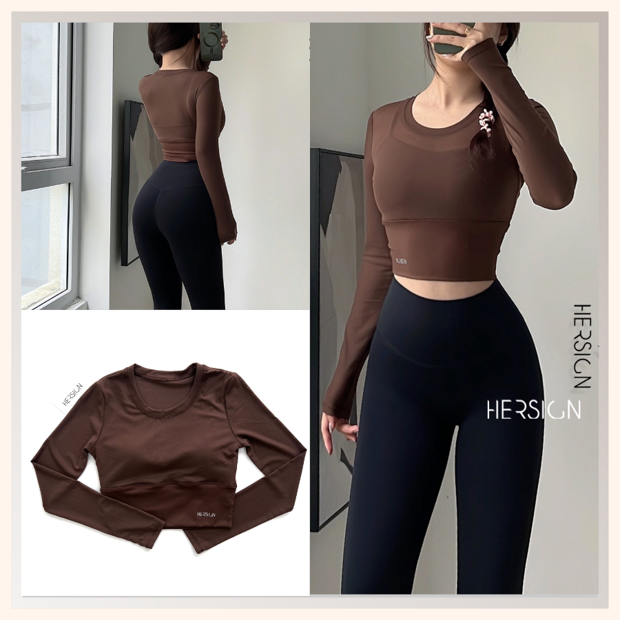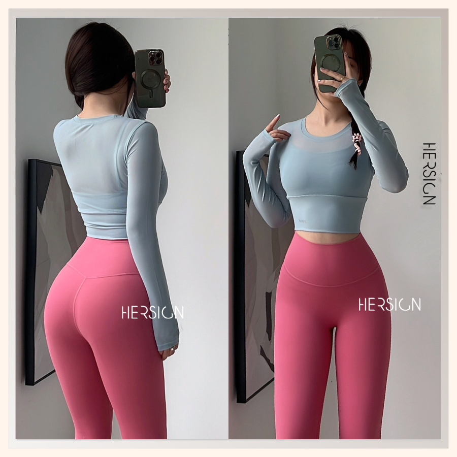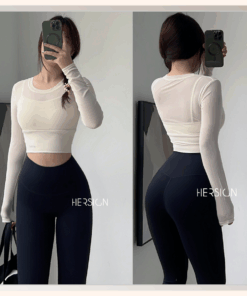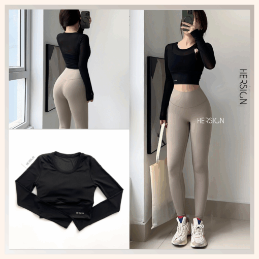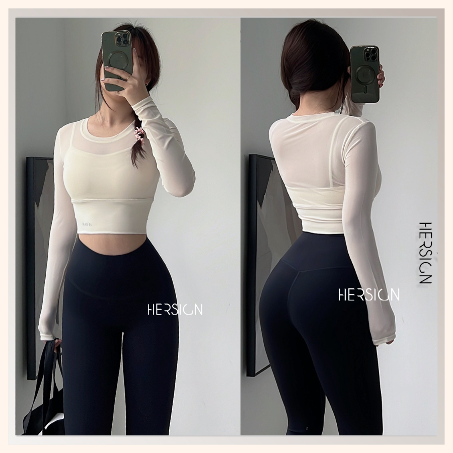 _Áo croptop dài tay 2 lớp. Lớp ngoài: lưới co dãn mềm mát.
