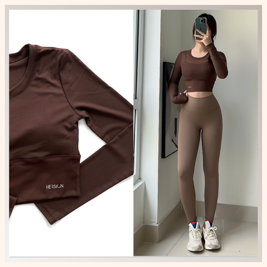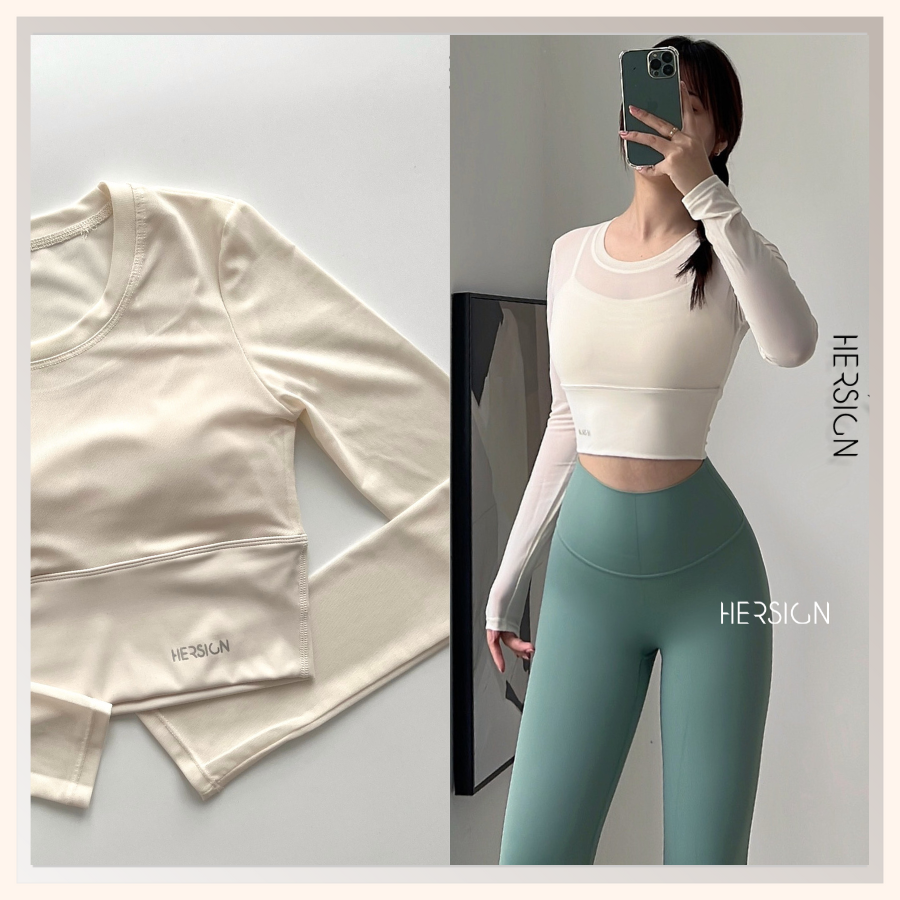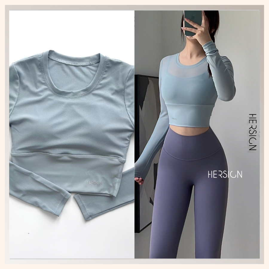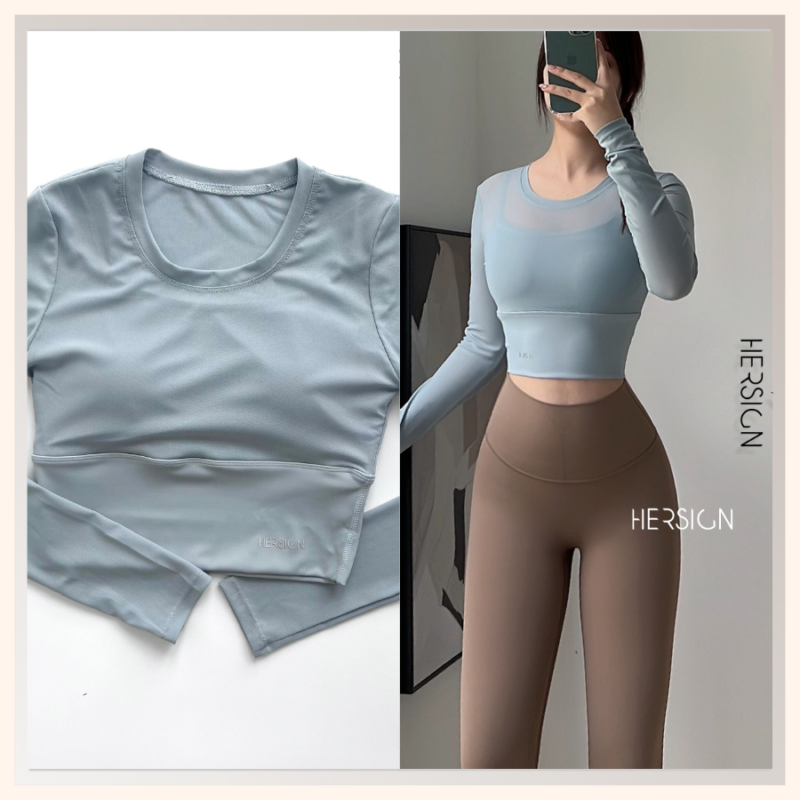 _Áo croptop dài tay 2 lớp. Lớp ngoài: lưới co dãn mềm mát.