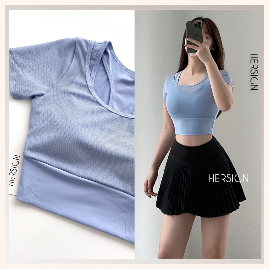 _Thiết kế áo croptop ngắn tay 2 lớp. Lớp lưới bên ngoài co dãn mềm mịn, lớp bra bên trong có sẵn mút đúc, chất mịn mát.